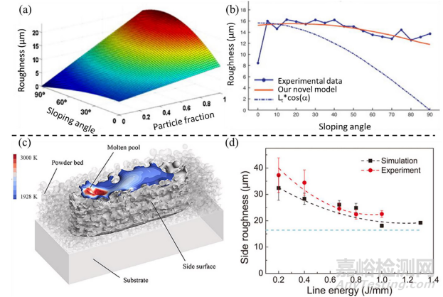 (a, b) 表面粗糙度作為分析粗糙度模型預(yù)測的傾斜角和顆粒分?jǐn)?shù)的函數(shù);(c) 多層 PBF 工藝模擬的側(cè)面,以及 (d) 實(shí)驗(yàn)和預(yù)測側(cè)面粗糙度的比較