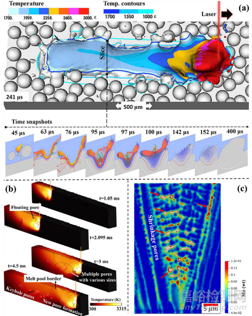 SS316L和 (b) Ti6Al4V LPBF 中熔池演化和孔隙形成的數(shù)值模擬;(c) Ni-Mo二元合金的AM中縮孔形成的模擬