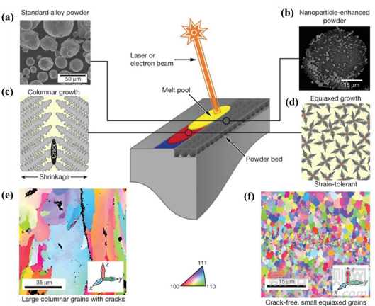 Al7075合金的PBF打印:(a)標(biāo)準(zhǔn)原料粉末(b)加入納米顆粒的粉末(c,d)樹枝狀生長模式從柱狀生長向等軸生長的轉(zhuǎn)變(e,f)添加納米顆粒的晶粒細(xì)化和裂紋消除