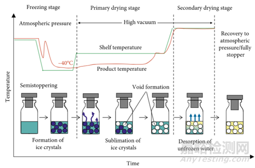 凍干過(guò)程包括三個(gè)階段:(1)冷凍階段,(2)初級(jí)干燥階段和(3)二次干燥階段,如圖所示