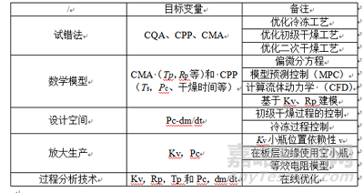 對(duì)凍干工藝的開(kāi)發(fā)和優(yōu)化,是從試錯(cuò)過(guò)程逐步向模型建立再向設(shè)計(jì)空間發(fā)展,通過(guò)這些流程能大大節(jié)省凍干工藝開(kāi)發(fā)過(guò)程中的時(shí)間和經(jīng)濟(jì)成本,獲得平臺(tái)化的凍干知識(shí)。如下圖為凍干工藝開(kāi)發(fā)和優(yōu)化的表格。