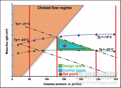 產(chǎn)品溫度的上限和下限結(jié)合公式(3)繪制以-Rp為斜率產(chǎn)品溫度線(xiàn)(黑色虛線(xiàn))。如果在初級(jí)干燥期間所需的產(chǎn)品溫度被選擇為-21℃(低于產(chǎn)品崩潰溫度),相應(yīng)的板層溫度由腔室室壓力和升華速率確定的。-21°C的產(chǎn)品溫度線(xiàn)與阻塞流線(xiàn)相交處的腔室壓力為130mtorr,因此,在這種情況下,可實(shí)現(xiàn)的最小室壓力為130mtorr。如果需要產(chǎn)品溫度達(dá)到-21℃,在太低的溫度下如<-24℃初級(jí)干燥將導(dǎo)致初級(jí)干燥時(shí)間大大延長(zhǎng),需要確定產(chǎn)品溫度的下限(黑色虛線(xiàn))。然而,通常產(chǎn)品溫度并不能直接控制,而是通過(guò)控制板層溫度和腔室壓力間接控制產(chǎn)品溫度。因此,板層溫度等溫線(xiàn)(藍(lán)色和綠色線(xiàn)條之間區(qū)域可確定的的所有線(xiàn)條)進(jìn)一步定義可能用于實(shí)現(xiàn)產(chǎn)品溫度在-21°C和-24°C之間的腔室壓力和板層溫度組合,在恒定的Ts值處由公式(1)和(2)繪制板層溫度等溫線(xiàn)(綠色和藍(lán)色實(shí)線(xiàn))。綠色陰影區(qū)域?yàn)樵O(shè)計(jì)空間,而藍(lán)色陰影區(qū)域?yàn)榭刂瓶臻g。該控制區(qū)域表明控制系統(tǒng)控制腔室壓力或板層溫度是在允許的范圍內(nèi)波動(dòng)(如,允許板層溫度為±3°C,腔室壓力為±15mtorr)。這些波動(dòng)范圍數(shù)據(jù)應(yīng)由凍干機(jī)制造商提供,但需要用戶(hù)在測(cè)試中進(jìn)行確認(rèn)。當(dāng)然,過(guò)程的實(shí)際設(shè)定點(diǎn)(即控制點(diǎn))在控制空間內(nèi)。