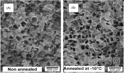 以上的設(shè)計(jì)空間是基于初級(jí)干燥階段,但進(jìn)入初級(jí)干燥階段進(jìn)行時(shí)間與凍干階段直接相關(guān)。較高的凍結(jié)溫度(較低的過(guò)冷度)導(dǎo)致形成較大尺寸的冰晶,冰晶的尺寸越大,實(shí)現(xiàn)的初級(jí)干燥效率就越高。另一方面,冰晶的大小決定了比表面積。比表面積的大小決定了二次干燥階段的擴(kuò)散和解吸速率。高凍結(jié)溫度導(dǎo)致形成大尺寸的冰,從而減少比表面積。這導(dǎo)致二次干燥效率降低,增加了成品中的水分殘留。因此,冷凍階段控制冷凍溫度有助于設(shè)計(jì)穩(wěn)健的干燥工藝。退火是將產(chǎn)品在高于最終冷凍溫度的溫度條件下保持一段時(shí)間以使組分結(jié)晶,有助于提高結(jié)晶度。退火導(dǎo)致冰晶生長(zhǎng)(如下圖),導(dǎo)致傳質(zhì)阻力系數(shù)Rp減少,縮短產(chǎn)品一次干燥時(shí)間。