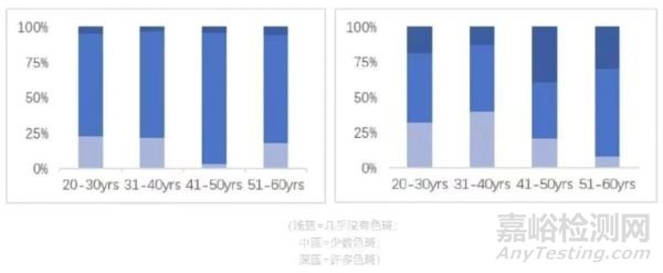 ▲ 法國(guó)女性(左)和中國(guó)女性(右)色斑發(fā)生率 (來(lái)源:中國(guó)化妝品學(xué)術(shù)研討會(huì)論文集,蛋殼研究院)
