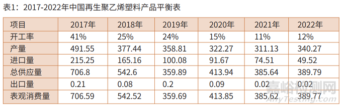 2017-2022年再生聚乙烯國內(nèi)顆粒產(chǎn)量逐年減少,2022年再生聚乙烯產(chǎn)量為340.27萬噸,較2017年減少151.28萬噸,降幅為30.71%。預(yù)計2023年經(jīng)濟緩慢復(fù)蘇,再生聚乙烯下游需求會有逐步好轉(zhuǎn),新舊料價差逐步回歸合理水平。同時禁止廢塑料進(jìn)口及國內(nèi)垃圾分類等政策利于回收體系完善,利好塑料回收產(chǎn)業(yè)(表1)。