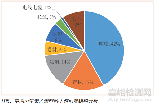 首先是由于下游需求的不景氣導(dǎo)致整個合成樹脂產(chǎn)品的銷售都受到了較大沖擊,其次疫情帶來的不確定性也大大降低了整個回收流程的工作效率,導(dǎo)致整體回收量的下降。從回收行業(yè)來看,與聚乙烯、聚丙烯相關(guān)的行業(yè)主要為農(nóng)膜、包裝及塑料制品行業(yè),占比約為整體下游行業(yè)的37.5%(圖3、4)。