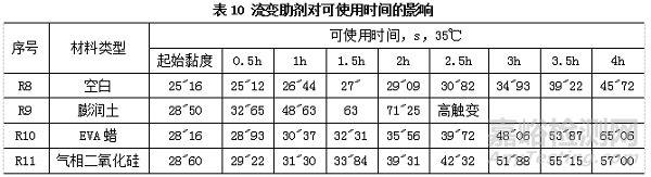 后續(xù)實(shí)驗(yàn)中,我們固定其他組分的比例,添加流變助劑有效分0.5%,測定流變助劑對涂料特性、可使用時(shí)間、流平性的影響。測試結(jié)果見表9、表10、表11:
