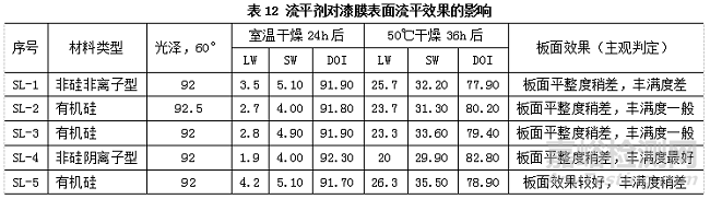 根據(jù)表12的測試結(jié)果,SL-4的量化數(shù)據(jù)表示可以提供漆膜最好的長波流平性及鮮映性,與主觀判定的結(jié)果一致。SL-4可作為該體系的最優(yōu)流平劑。