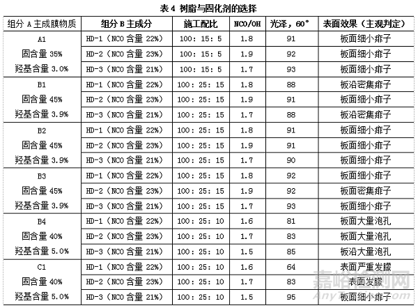 依據(jù)表4可見,水性羥基丙烯酸乳液與非親水性固化劑的相容性不佳,而水性高羥丙烯酸/聚氨酯分散體與其相容性可被接受,可以搭配使用。A1與B2形成的板面痱子較少,HD-2與HD-3形成的痱子相對較少。A1、B3在高光澤方面表現(xiàn)最佳。選定A1與B3復(fù)配作為主成膜物質(zhì),HD-2與HD-3復(fù)配成HD-4作為固化劑。