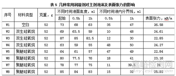 依據(jù)表6流平性的數(shù)據(jù),W4表現(xiàn)出較好的流平性數(shù)據(jù),且其具有低泡性。由此選定W4與W5復(fù)配作為后續(xù)主劑的潤濕劑,同時(shí)保證低表面張力的同時(shí),兼顧低泡性和流平性。