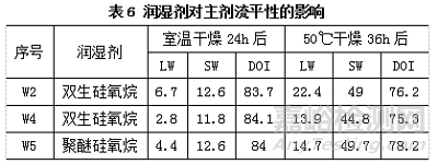 從表5的結(jié)果分析可知,W3、W5、W6表現(xiàn)出較低的表面張力,W2、W4、W5表現(xiàn)出較好的低泡性,結(jié)合自消泡性(液面高度)和脫泡性(液內(nèi)分界線)的表現(xiàn),初選W2、W4、W5進(jìn)行后續(xù)流平性的測試評定。
