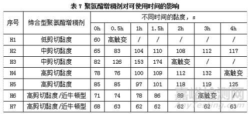 增稠劑的主要作用就是調(diào)整涂料的黏度和流動狀態(tài),使其滿足儲存性能、施工性能等要求。要完全滿足這些要求,不是單一一支增稠劑或者單靠增稠劑就能解決的,往往需要同類別或同效果材料進(jìn)行復(fù)配。此處增稠劑的選擇,我們重點(diǎn)考慮對黏度的貢獻(xiàn)以及對雙組分涂料可使用時(shí)間的影響,可使用時(shí)間一般的指標(biāo)是3-4h。實(shí)驗(yàn)中,我們將主劑黏度調(diào)整至60±5KU,按照主劑:固化劑:水=100:25:15的比例進(jìn)行調(diào)配,通過測定室溫下涂-4黏度的變化確認(rèn)可使用時(shí)間的長短,測試結(jié)果如表7: