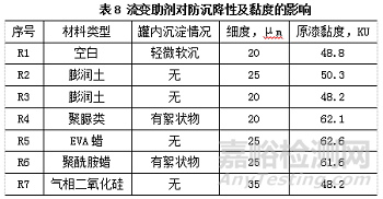 流變助劑是較大程度上調(diào)整液體流變特性的一類材料。單用情況下,尤其是無機(jī)類的流變助劑,對涂料的黏度及流變特性的改變較弱。但在與聚氨酯增稠劑復(fù)配使用時(shí),可以達(dá)到1+1>2的互補(bǔ)效果。流變助劑主要關(guān)注抗流掛性能、可使用時(shí)間、流平性??沽鲯斓燃壷饕脕碓u估涂料調(diào)配后的抗沉降能力、遮黑邊的能力和防堆邊的能力。涂料本身的抗流掛能力過強(qiáng),可能會影響漆膜的流平平整度,所以評估抗流掛性的同時(shí)需要同時(shí)兼顧流平性。在流變助劑對可使用時(shí)間影響的實(shí)驗(yàn)中,我們設(shè)定流變助劑0.5%的有效分添加量,觀測罐內(nèi)3天的50℃熱儲穩(wěn)定性。依據(jù)結(jié)果,選擇熱儲后狀態(tài)最好的R3、R5、R7做后續(xù)的評估。R3對黏度的貢獻(xiàn)小,對細(xì)度的影響小,所以暫時(shí)放棄R2。測試結(jié)果見表8: