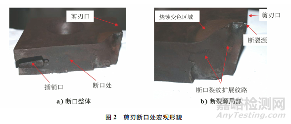 斷裂試樣為飛剪剪刃的一部分,斷裂發(fā)生在兩固定孔之間,剪刃沿垂直于刀刃方向斷開,斷口表面較為平整,斷裂源位于剪刃的刀刃處,斷裂源附近斷口表面存在明顯的裂紋擴展紋路,斷裂源附近存在明顯燒蝕變色區(qū)域。結(jié)合飛剪的工作環(huán)境及受力狀態(tài)可知:斷裂源位于剪刃中部區(qū)域,該區(qū)域為飛剪剪刃在剪切高溫狀態(tài)軋材時受力最集中,且受高溫影響最明顯的區(qū)域,燒蝕變色的原因為該區(qū)域長期受高溫影響。