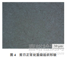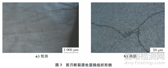 使用洛氏硬度計對飛剪剪刃斷裂源附近外表面進行硬度測試,其洛氏硬度約為52HRC;對遠離斷裂源部位進行硬度測試,洛氏硬度約為61HRC。