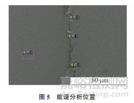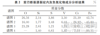 對剪刃斷裂源附近表面“龜裂”處裂紋縫隙內(nèi)的灰色氧化物進行掃描電鏡和能譜分析,結(jié)果如圖5和表2所示。由表2可知:其主要含有Fe、O、Cr等元素,說明灰色氧化物為氧化鐵和氧化鉻的混合物。