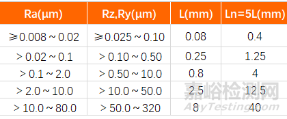 Ra、Rz、Ry的取樣長(zhǎng)度L與評(píng)定長(zhǎng)度Ln選用值: