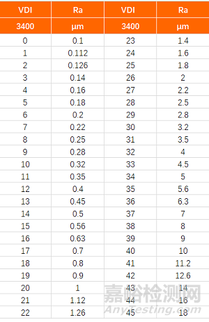 VDI3400 標(biāo)準(zhǔn)與Ra 對(duì)照表: