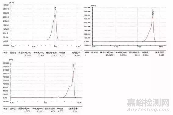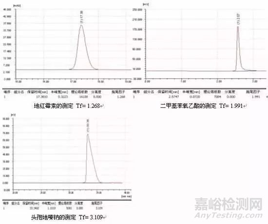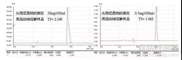 由于樣品過載引起的峰形后拖不能通過改變色譜條件消除。如果發(fā)現(xiàn)過載,需降低進(jìn)樣量(包括進(jìn)樣體積或濃度),進(jìn)樣量越小,峰形越好,例子如頭孢尼西鈉的測定: