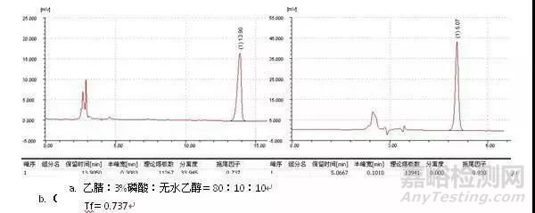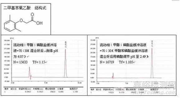 將流動(dòng)相的pH調(diào)至比弱酸pKa小2以上,比弱堿pKa大2以上,可有效抑制易離子化待測物的電離,從而取得良好峰形。例子如二甲基苯氧乙酸的測定: