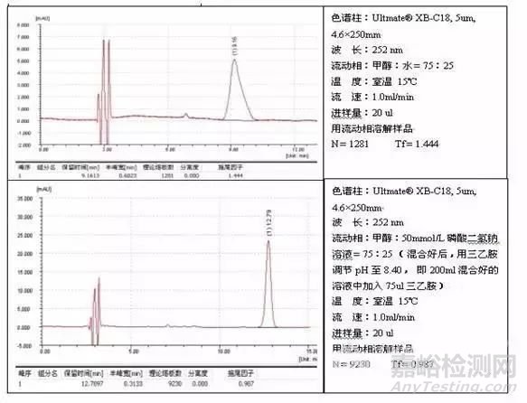 加入三乙胺改善峰形的時(shí)候,有兩點(diǎn)需要注意:1)三乙胺的堿性很強(qiáng),加入三乙胺后流動(dòng)相的pH可能超出色譜柱的使用范圍,對色譜柱造成損傷。pH的改變也會(huì)導(dǎo)致出峰時(shí)間的顯著變化,可能引起的其它問題,建議流動(dòng)相中加入三乙胺后回調(diào)至未加入前的pH值。通常即使pH回調(diào)過后,由于三乙胺成為了固定相的一部分,保留時(shí)間也有較大變化;2)三乙胺在210nm處有比較強(qiáng)的吸收,如果液相方法中檢測波長在210nm以下測定時(shí)需要謹(jǐn)慎使用。