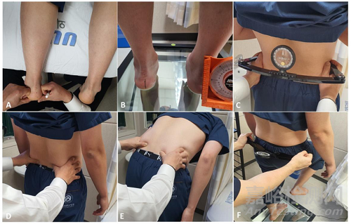 骨盆抬高表示左右髂嵴之間的高度差。它是用測(cè)角儀測(cè)量的,病人站在拳頭寬的距離上。角度計(jì)的左右刀片放置在髂嵴的最高點(diǎn),測(cè)量骨盆的高度(下圖C)。當(dāng)一個(gè)髂嵴相對(duì)于另一側(cè)的髂嵴升高時(shí),該值表示為正值,較大的值表示左右骨盆的高度差異較大。為了評(píng)估骨盆傾斜的存在,研究者將拇指放在髂后上棘上(PSIS),其余手指放在患者的髂嵴上(下圖D)。然后,研究人員要求患者將下背部向前彎曲90度,并評(píng)估研究人員拇指向前傾斜程度的差異(圖1E)。當(dāng)兩個(gè)PSIS的傾斜度對(duì)稱時(shí),表示為“-”,當(dāng)左PSIS的傾斜度大于左PSIS的傾斜度時(shí),表示為“+”。