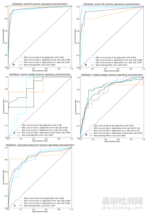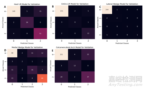 結(jié)果顯示,腳跟提升的準(zhǔn)確性為89.7%。整體提升的準(zhǔn)確性為94.8%。外側(cè)楔形支撐的準(zhǔn)確性為72.2%。內(nèi)側(cè)楔形支撐的準(zhǔn)確性為98.4%。跗骨踵處支撐的準(zhǔn)確性為79.8%。分別對(duì)應(yīng)下圖A~E。