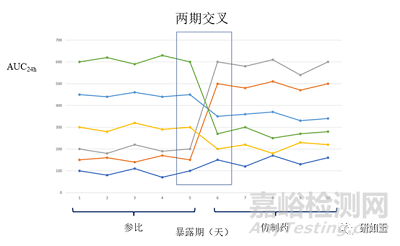 圖3生物等效性研究:仿制藥和參比之間受試者內(nèi)變異性的圖示。假設(shè)6個(gè)人在前五個(gè)時(shí)期接受參比藥物治療,在后五個(gè)時(shí)期接受仿制藥治療。為了演示的目的,參比制劑的受試者內(nèi)變異性較小。相比之下,仿制藥的受試者內(nèi)變異性較高(即受試者的暴露量隨仿制藥制劑隨機(jī)變化)。受試者與制劑之間沒有相互作用,即對于每個(gè)受試者,兩種制劑的平均暴露量(在一段時(shí)間內(nèi))保持相同。在經(jīng)典的兩期交叉試驗(yàn)中(第5期和第6期),圖2和圖3中的情況下暴露量相同。因此,這種兩個(gè)周期的交叉試驗(yàn)不能通過制劑相互作用將受試者內(nèi)變異性的差異區(qū)分開來。它們都包含在方差分析(ANOVA)的殘差方差中。為了評估這種差異,至少需要在四個(gè)周期內(nèi)重復(fù)交叉試驗(yàn)(兩周期的參比和兩周期的試驗(yàn)藥物)。AUC24h,從0到24小時(shí)的血漿濃度-時(shí)間曲線下的面積。