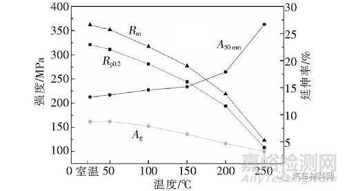 2)在室溫至250 ℃范圍內(nèi),隨拉伸溫度的升高,材料的規(guī)定塑性延伸強(qiáng)度、抗拉強(qiáng)度、最大力塑性延伸率會逐漸下降,其中100~250 ℃范圍內(nèi)下降尤為明顯;但斷后伸長率卻逐漸增加,尤其在150 ℃溫度以上增加更為明顯;