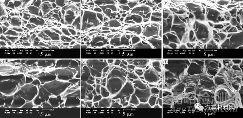 4)隨拉伸溫度的升高,韌窩尺寸增大,深度減小,條帶增多,強(qiáng)化相對位錯運(yùn)動的阻礙會減弱,材料強(qiáng)度會不斷降低,而延伸率則不斷升高。