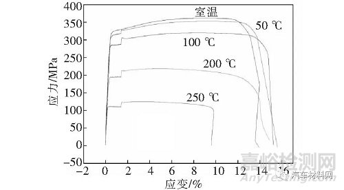 1)7003-T6鋁合金材料無明顯的屈服平臺,室溫至250 ℃溫度下的應(yīng)力-應(yīng)變曲線變化基本一致。室溫至50 ℃溫度范圍內(nèi)應(yīng)力相差并不大,而100~250 ℃溫度范圍內(nèi)應(yīng)力變化較為明顯;