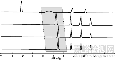 (4)每次梯度洗脫程序運行完之后必須對色譜柱進行徹底平衡,使其恢復(fù)到初始的狀態(tài),需讓10~30倍柱容積的初始流動相流經(jīng)色譜柱,使固定相和初始流動相達到完全平衡,平衡不好會影響下一針樣品的分離度和保留時間:下圖所示的平衡時間從從上到下分別為6、7、8、9分鐘,可以看出平衡6、7分鐘第一個峰的保留時間有明顯的變化,說明6到7分鐘的平衡時間不足,而8、9分鐘所有峰保留時間變化不大,說明色譜系統(tǒng)平衡充足;