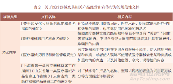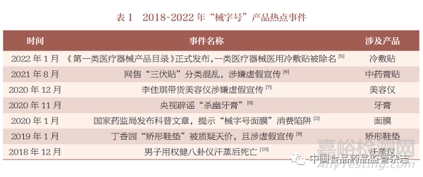 “械字號(hào)”產(chǎn)品相關(guān)熱點(diǎn)事件可歸類(lèi)為以下3種情況。一是利用網(wǎng)絡(luò)非法銷(xiāo)售未經(jīng)注冊(cè)的醫(yī)療器械,虛假、夸大宣傳,欺騙消費(fèi)者[11]。二是生活用品冒用“械字號(hào)”。例如,將鞋墊、床墊等生活用品以醫(yī)療器械名義對(duì)外銷(xiāo)售、將第一類(lèi)醫(yī)療器械醫(yī)用護(hù)理墊做成全棉內(nèi)褲、將彈性繃帶做成全棉襪子、將牙科潔治器做成生活用品牙簽等[12]。三是美容相關(guān)產(chǎn)品的屬性不明和虛假宣傳情況。例如,將“妝字號(hào)”產(chǎn)品作為注射用醫(yī)美針劑銷(xiāo)售[13]、凝膠類(lèi)“械字號(hào)”產(chǎn)品名稱(chēng)五花八門(mén)且存在同一產(chǎn)品多類(lèi)備案號(hào)的問(wèn)題、面膜和牙膏打著醫(yī)用產(chǎn)品的噱頭誤導(dǎo)消費(fèi)者[14]、美容儀使用暗示醫(yī)療效果的詞語(yǔ)進(jìn)行宣傳[15]等。