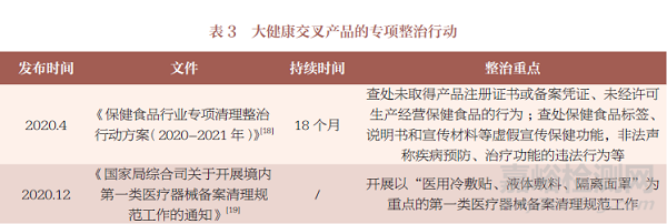 大健康交叉產(chǎn)品的監(jiān)管復(fù)雜性多呈現(xiàn)為監(jiān)管邊界模糊或職責(zé)不清,導(dǎo)致部分產(chǎn)品出現(xiàn)監(jiān)管重疊或空白的現(xiàn)象。近年來(lái),為切實(shí)解決“械字號(hào)”產(chǎn)品質(zhì)量和安全存在的突出問(wèn)題,國(guó)家開(kāi)展了多次多部門(mén)聯(lián)合的專(zhuān)項(xiàng)整治行動(dòng)(表3)。