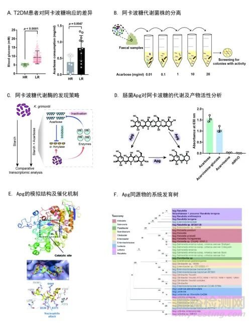 此外,研究組通過(guò)結(jié)構(gòu)模擬闡釋了Apg的關(guān)鍵功能基團(tuán)和催化阿卡波糖降解的潛在分子機(jī)制。種系發(fā)育分析顯示,Apg及其同源基因廣泛存在于腸道微生物尤其是克雷伯氏菌屬。這表明腸道細(xì)菌代謝引起的阿卡波糖耐藥風(fēng)險(xiǎn)在人群中普遍存在。這種“誘導(dǎo)降解失活”機(jī)制可能是導(dǎo)致非抗生素耐藥的主要原因之一。對(duì)于阿卡波糖低響應(yīng)的患者,可考慮通過(guò)調(diào)節(jié)腸道微生態(tài)或靶向干預(yù)代謝酶的策略來(lái)減少耐藥現(xiàn)象的發(fā)生。