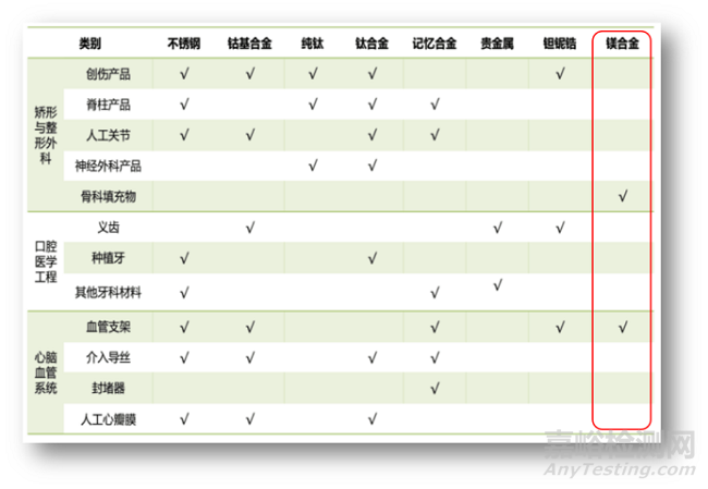 各醫(yī)用金屬材料的醫(yī)療應(yīng)用對(duì)比