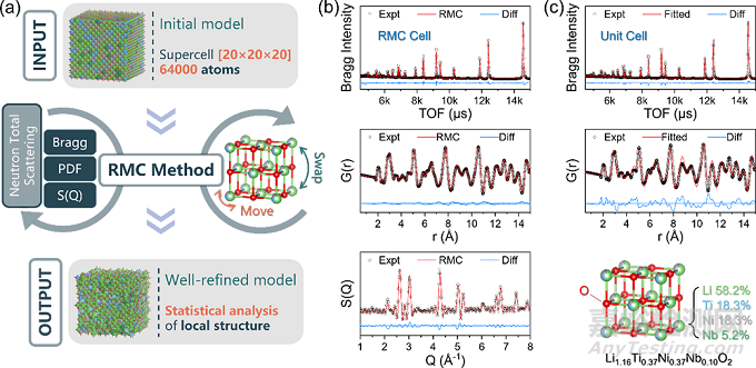 近日,中國(guó)科學(xué)院物理研究所研究人員與美國(guó)橡樹(shù)嶺國(guó)家實(shí)驗(yàn)室研究人員合作,利用中子全散射(Neutron Total Scattering)實(shí)驗(yàn)技術(shù)并結(jié)合逆蒙特卡洛(Reverse Monte-Carlo, RMC)數(shù)據(jù)分析方法研究了無(wú)序巖鹽模型正極材料Li1.16Ti0.37Ni0.37Nb0.1O2,還原構(gòu)建了包含64000個(gè)原子位點(diǎn)的大尺度結(jié)構(gòu)模型。此前研究發(fā)現(xiàn),結(jié)構(gòu)中Ni2+發(fā)生偏聚使得過(guò)渡金屬陽(yáng)離子和鋰離子分布明顯偏離理論模型中陽(yáng)離子隨機(jī)分布的情形。實(shí)驗(yàn)觀察到的可傳導(dǎo)鋰離子的四面體空位數(shù)目(理論模型中預(yù)測(cè)的四面體空位周?chē)缓袖囯x子,不含有過(guò)渡金屬陽(yáng)離子,0-TM)顯著低于理論模型預(yù)測(cè)的含量。進(jìn)一步對(duì)超胞結(jié)構(gòu)進(jìn)行統(tǒng)計(jì)分析發(fā)現(xiàn),過(guò)渡金屬Ti4+離子在晶格中存在偏離TM-O八面體中心位點(diǎn)分布的現(xiàn)象。第一性原理計(jì)算結(jié)果表明,該偏移引起的晶格畸變顯著影響鋰離子遷移能壘,使得一部分原本不具有活性的鋰擴(kuò)散通道(四面體空位周?chē)?個(gè)過(guò)渡金屬陽(yáng)離子,1-TM)被激活。將此修正因素引入鋰離子滲流模型后發(fā)現(xiàn),這部分額外的鋰離子擴(kuò)散通道使得整體參與滲流的鋰離子含量顯著上升,結(jié)構(gòu)分析中觀測(cè)到的可傳導(dǎo)鋰離子的含量與電化學(xué)測(cè)試中材料實(shí)際的可用容量基本符合。