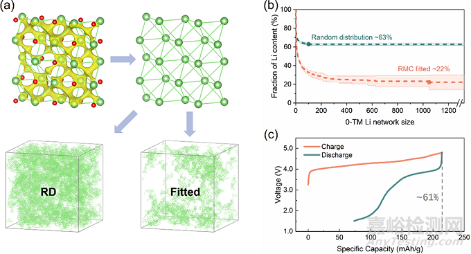 圖3 無(wú)序超胞結(jié)構(gòu)中鋰滲流網(wǎng)絡(luò)的計(jì)算、可視化以及與電化學(xué)實(shí)驗(yàn)結(jié)果的對(duì)比
