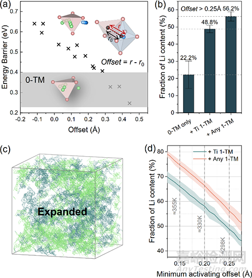 圖5 DFT計(jì)算過(guò)渡金屬偏移引起的鋰擴(kuò)散勢(shì)壘變化及更新后的鋰滲流網(wǎng)絡(luò)
