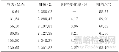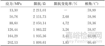 為研究鋼板彎曲過程中下表面應(yīng)力狀態(tài)對阻抗、相角測量結(jié)果的影響,將磁彈性傳感器放置于鋼板下表面中心位置,采用2 mA的激勵電流以及200 Hz的激勵頻率對鋼板進(jìn)行磁化,檢測鋼板下表面阻抗隨應(yīng)力的變化情況,結(jié)果如表2所示。