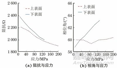圖5 鋼板上下表面阻抗與相角隨應(yīng)力的變化曲線