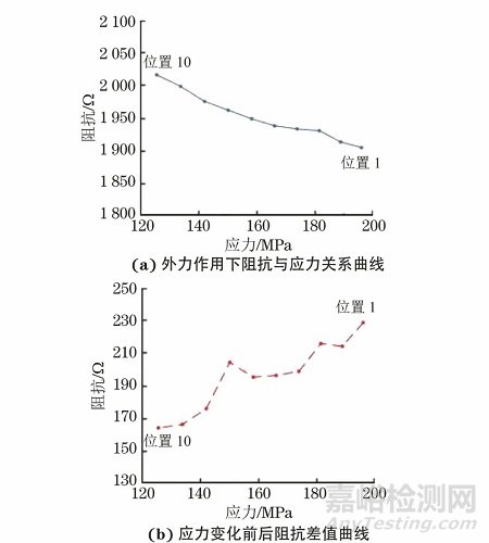 圖6(a)表明鋼板受500 N外力作用時(shí),應(yīng)力隨距離的增加逐漸降低,阻抗隨應(yīng)力的變化較為均勻。圖6(b)表明在不受材料因素影響只受應(yīng)力影響的情況下,阻抗變化量總體上隨應(yīng)力的增加而增大,驗(yàn)證了一定距離范圍內(nèi)彎曲應(yīng)力檢測結(jié)果的有效性。