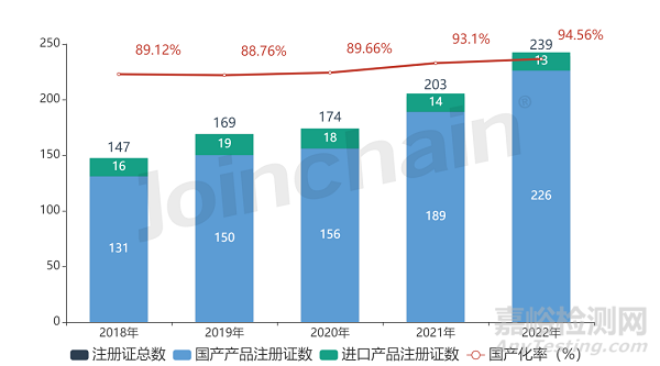 截至2022年12月31日,外固定支架有效產(chǎn)品注冊總數(shù)為239件,其中國產(chǎn)產(chǎn)品有226件,進口產(chǎn)品13件,國產(chǎn)化率為94.56%。