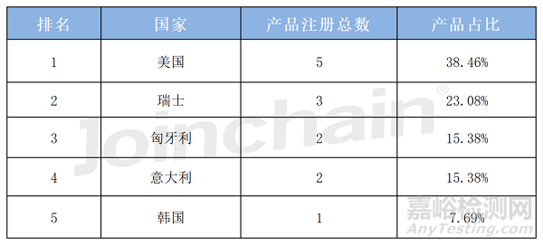 截至2022年12月31日,外固定支架產(chǎn)品進口產(chǎn)品有13件,其中美國的產(chǎn)品數(shù)量最多,為5件。