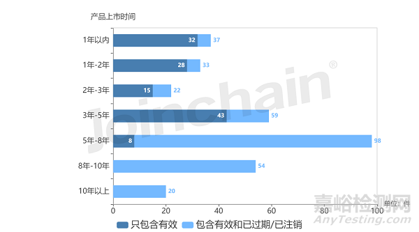 (注:產(chǎn)品上市時間的統(tǒng)計為(截止日期-產(chǎn)品首次注冊(或首次備案)日期)/365)