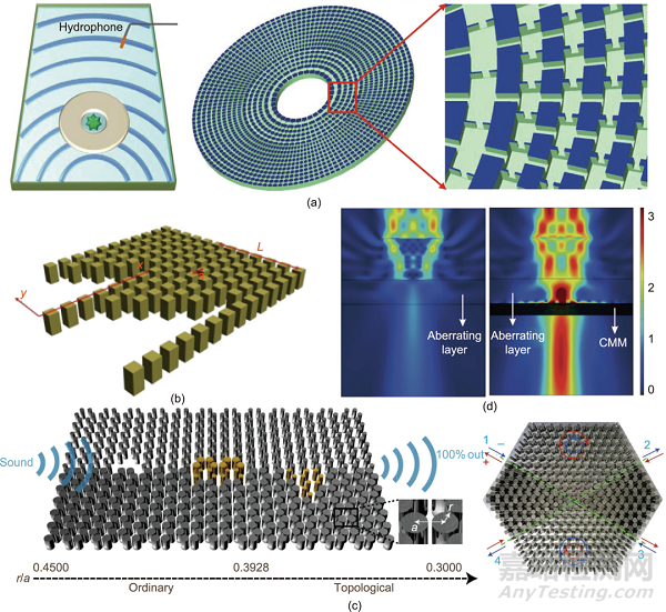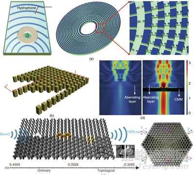 圖3. (a)聲學圓柱形隱身斗篷的結構示意圖;(b)在y方向上具有周期性布置的聲子晶體聲二極管示意圖;(c)聲學拓撲絕緣體示意圖,由兩種聲子“石墨烯”構成,具有相同的晶格常數(shù),但不同的“原子”(即不銹鋼棒)半徑(左)和交叉波導分離器照片(右);(d)僅在顱骨(左)和經(jīng)過CMM后再經(jīng)過顱骨(右)的未聚焦波束的聲強度場分布。圖中所有縮寫的定義見引用參考文獻。