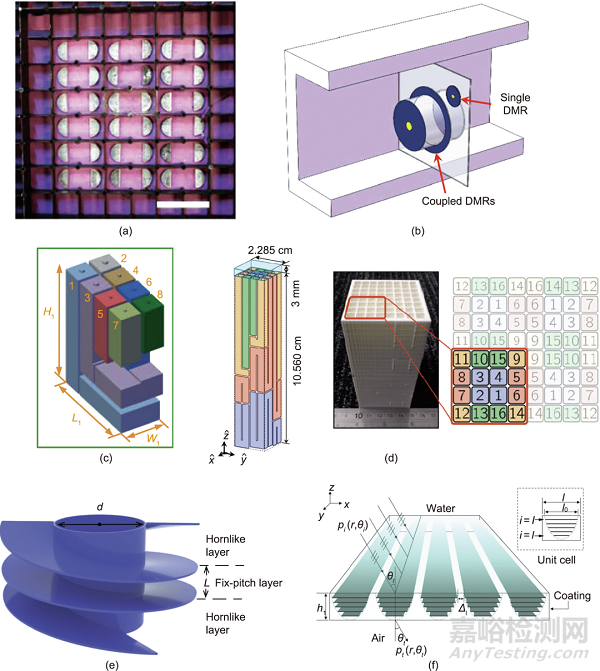 第二種策略基于各向異性AMMs,通過耦合倏逝波分量,可以將倏逝波轉換為傳播波。一般來說,這種類型的AMMs通過激勵聲波波導內的陷波共振。通過將倏逝波轉換為傳播波,各向異性的AMMs甚至可以在遠場實現(xiàn)高分辨率成像。例如,Li等使用36個計算機數(shù)字控制的黃銅翅片將倏逝波分量轉換為傳播波,傳播波可以傳播到遠場,物體的深亞波長特征得以保持完整[圖2(c)]。