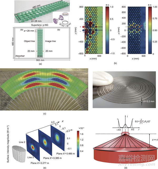 圖2. 用于成像的AMMs。(a)基于薄膜型AMMs制成的聲學超透鏡;(b)使用平面聲學超透鏡對兩個異相源進行超分辨率成像;(c)亞衍射限制雙光源放大成像的實驗演示;(d)聲學超表面透鏡(上圖)和克服倏逝波探測極限的超振蕩場模式聲場分布(下圖);(e)經(jīng)超透鏡聚焦之后的近平面波的聲強的數(shù)值仿真結果。圖中所有縮寫的定義見引用參考文獻。