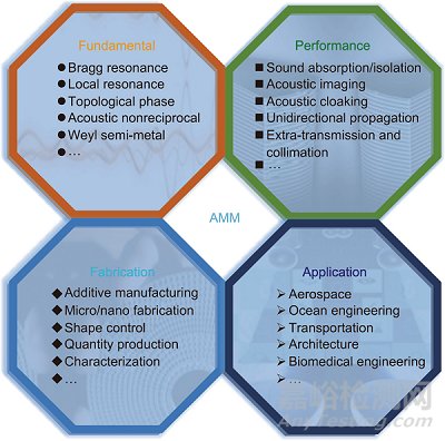 對AMMs的研究為航空工業(yè)、軌道交通、生物醫(yī)學、新基礎設施建設等領域的工程應用奠定了堅實的基礎。然而,如何設計和優(yōu)化AMMs以滿足現(xiàn)實世界中的需求仍然是一個挑戰(zhàn)。迄今為止,有大量關于AMMs的評論文章和書籍,它們全面、詳細地闡述了其物理本質、結構的具體類別和發(fā)展歷史。在這里,我們將通過回顧在吸聲/隔聲、聲成像、聲隱身等領域取得的重大進展,重點介紹AMMs的實際應用。此外,我們還將概述AMMs在未來聲學工程應用中的機遇和挑戰(zhàn)。