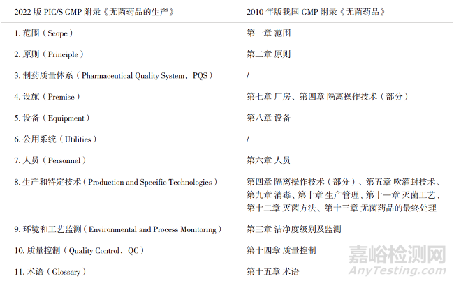 表1 PIC/S GMP 附錄《無菌藥品的生產(chǎn)》與我國GMP 附錄《無菌藥品》的比較